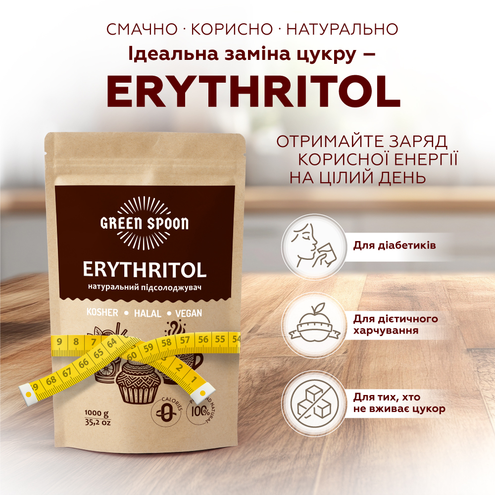 Натуральний цукрозамінник Еритрит GREEN SPOON – не містить калорій, без ГМО, має нульовий глікемічний індекс і не впливає на рівень цукру в крові. Підходить для людей із цукровим діабетом, для людей, які стежать за своєю вагою, для різного виду дієт.